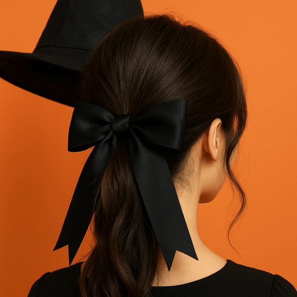 低めのポニーテールに大きめの黒リボンをプラス。シンプルながらも大人の魅力が漂う、魔女コスチュームとの相性抜群のアレンジです。毛先をゆるく巻いて、動きをつけるのがポイント。