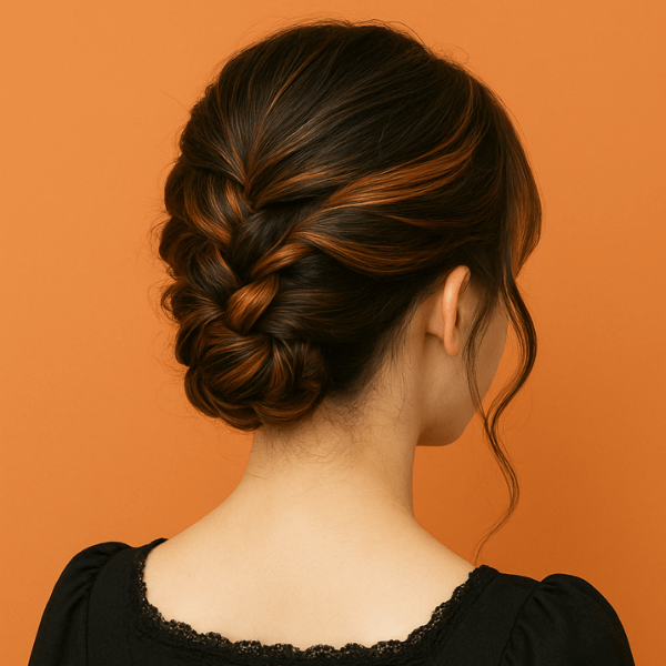 さりげなくオレンジ系のハイライトを入れた髪を、編み込みでまとめたアップスタイル。パンプキンカラーがライトに当たって映え、写真映えも抜群。
