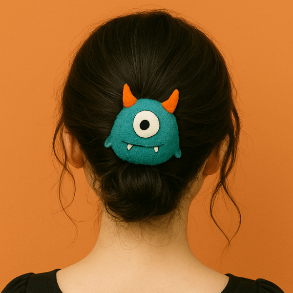 ゆるくまとめたシニヨンに、目玉やコウモリモチーフのヘアピンを散りばめて遊び心をプラス。カジュアルなコスチュームにも合わせやすく、忙しいママさんにもおすすめ。